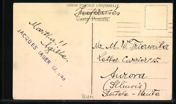 Personenbezogene Daten auf der Rückseite der Karte wurden durch blauen Textmarker unkenntlich gemacht. Die blauen Stellen sind auf die Vorderseite durchgeweicht und wirken sich negativ auf das Postkartenfoto aus