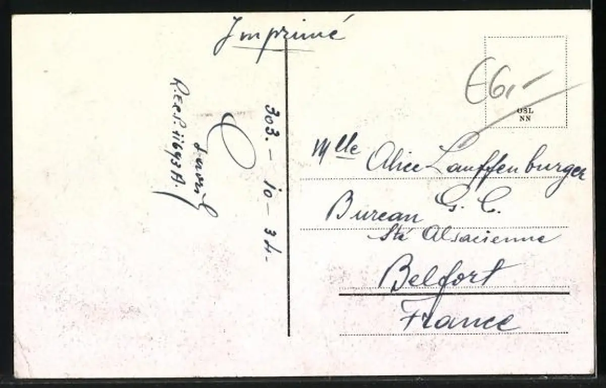 Personenbezogene Daten auf der Rückseite der Karte wurden durch blauen Textmarker unkenntlich gemacht. Die blauen Stellen sind auf die Vorderseite durchgeweicht und wirken sich negativ auf das Postkartenfoto aus