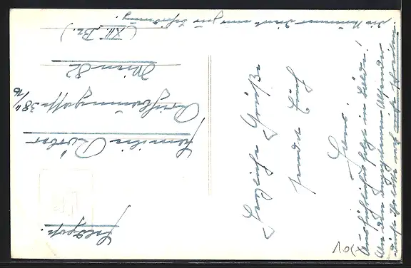 Personenbezogene Daten auf der Rückseite der Karte wurden durch blauen Textmarker unkenntlich gemacht. Die blauen Stellen sind auf die Vorderseite durchgeweicht und wirken sich negativ auf das Postkartenfoto aus