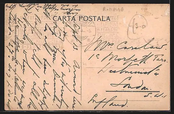 Personenbezogene Daten auf der Rückseite der Karte wurden durch blauen Textmarker unkenntlich gemacht. Die blauen Stellen sind auf die Vorderseite durchgeweicht und wirken sich negativ auf das Postkartenfoto aus