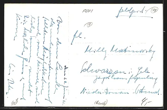 Personenbezogene Daten auf der Rückseite der Karte wurden durch blauen Textmarker unkenntlich gemacht. Die blauen Stellen sind auf die Vorderseite durchgeweicht und wirken sich negativ auf das Postkartenfoto aus