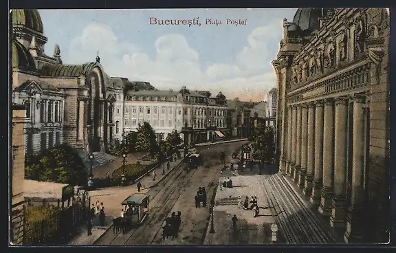 AK Bucuresti, Piata Postei, Strassenpartie mit Strassenbahn