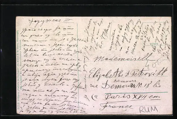 Personenbezogene Daten auf der Rückseite der Karte wurden durch blauen Textmarker unkenntlich gemacht. Die blauen Stellen sind auf die Vorderseite durchgeweicht und wirken sich negativ auf das Postkartenfoto aus