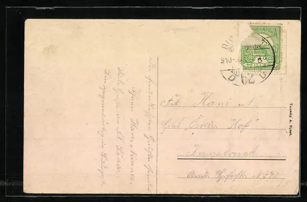 alte Ansichtskarte, gelaufen 1910, Briefmarke tw. entfernt, Eckknicke li. unten u. re. oben, Stempelspur, Bugspur li. oben
