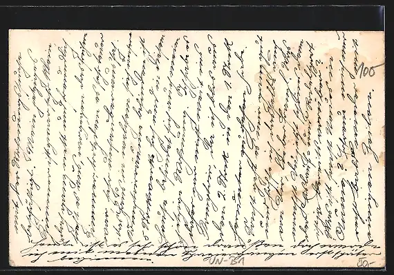 Personenbezogene Daten auf der Rückseite der Karte wurden durch blauen Textmarker unkenntlich gemacht. Die blauen Stellen sind auf die Vorderseite durchgeweicht und wirken sich negativ auf das Postkartenfoto aus