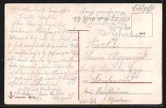 Personenbezogene Daten auf der Rückseite der Karte wurden durch blauen Textmarker unkenntlich gemacht. Die blauen Stellen sind auf die Vorderseite durchgeweicht und wirken sich negativ auf das Postkartenfoto aus