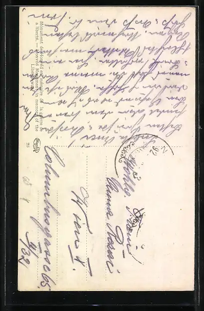 Personenbezogene Daten auf der Rückseite der Karte wurden durch blauen Textmarker unkenntlich gemacht. Die blauen Stellen sind auf die Vorderseite durchgeweicht und wirken sich negativ auf das Postkartenfoto aus