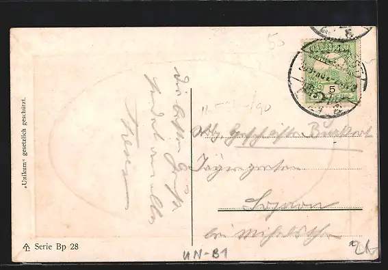 Personenbezogene Daten auf der Rückseite der Karte wurden durch blauen Textmarker unkenntlich gemacht. Die blauen Stellen sind auf die Vorderseite durchgeweicht und wirken sich negativ auf das Postkartenfoto aus