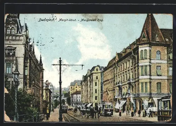 AK Budapest, Margit-körut, Margareten-Ring, Strassenbahnen, Pferdegespann