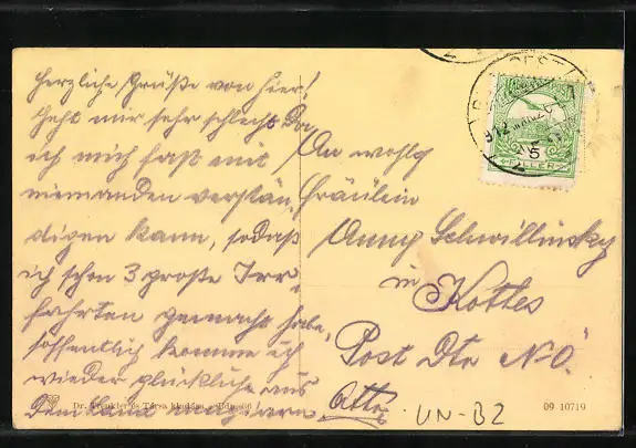 Personenbezogene Daten auf der Rückseite der Karte wurden durch blauen Textmarker unkenntlich gemacht. Die blauen Stellen sind auf die Vorderseite durchgeweicht und wirken sich negativ auf das Postkartenfoto aus