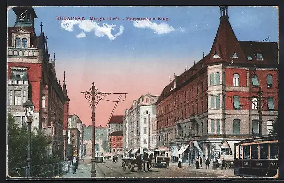 AK Budapest, Strassenpartie am Margarethenring, Strassenbahn