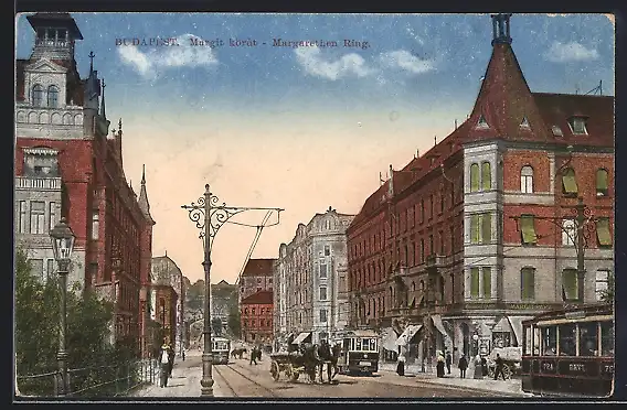 AK Budapest, Strassenpartie am Margarethenring, Strassenbahn