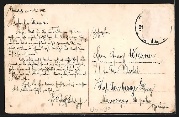 gelaufen 1915, Briefmarke entfernt, rückseitig Oberflächenschaden, Eckknick re. unten, guter Zustand