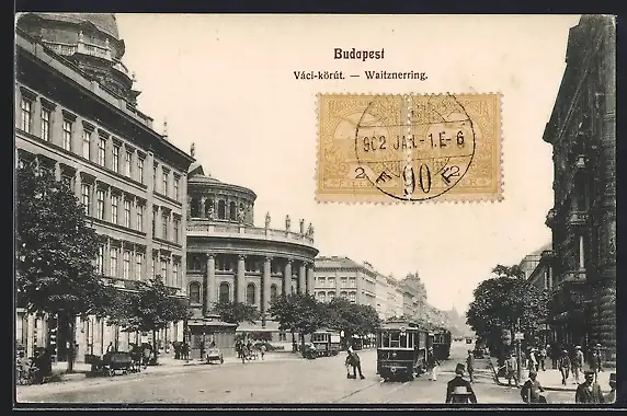 AK Budapest, Waitznerring mit Strassenbahnn und Passanten