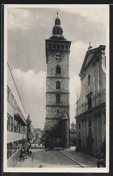 AK Budweis / Ceske Budejovice, Strassenpartie am Schwarzen Turm