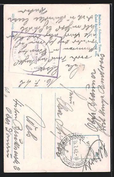 Personenbezogene Daten auf der Rückseite der Karte wurden durch blauen Textmarker unkenntlich gemacht. Die blauen Stellen sind auf die Vorderseite durchgeweicht und wirken sich negativ auf das Postkartenfoto aus