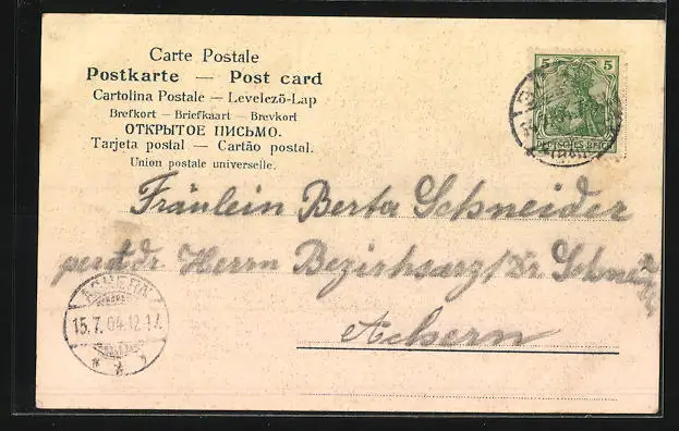 Personenbezogene Daten auf der Rückseite der Karte wurden durch blauen Textmarker unkenntlich gemacht. Die blauen Stellen sind auf die Vorderseite durchgeweicht und wirken sich negativ auf das Postkartenfoto aus