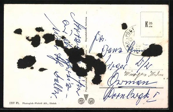 Personenbezogene Daten auf der Rückseite der Karte wurden durch blauen Textmarker unkenntlich gemacht. Die blauen Stellen sind auf die Vorderseite durchgeweicht und wirken sich negativ auf das Postkartenfoto aus