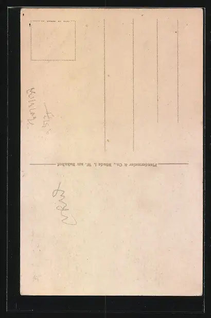 Personenbezogene Daten auf der Rückseite der Karte wurden durch blauen Textmarker unkenntlich gemacht. Die blauen Stellen sind auf die Vorderseite durchgeweicht und wirken sich negativ auf das Postkartenfoto aus