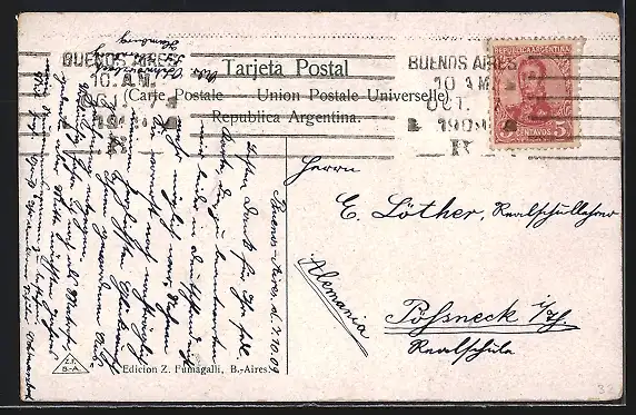 Personenbezogene Daten auf der Rückseite der Karte wurden durch blauen Textmarker unkenntlich gemacht. Die blauen Stellen sind auf die Vorderseite durchgeweicht und wirken sich negativ auf das Postkartenfoto aus