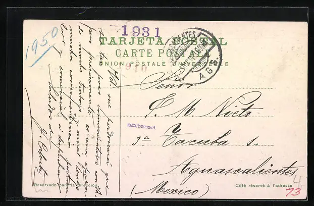 Personenbezogene Daten auf der Rückseite der Karte wurden durch blauen Textmarker unkenntlich gemacht. Die blauen Stellen sind auf die Vorderseite durchgeweicht und wirken sich negativ auf das Postkartenfoto aus
