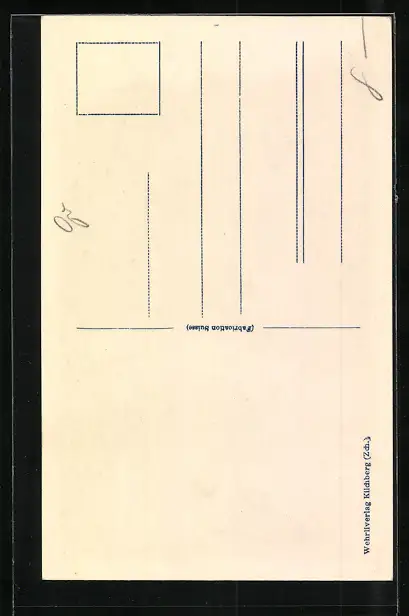 Personenbezogene Daten auf der Rückseite der Karte wurden durch blauen Textmarker unkenntlich gemacht. Die blauen Stellen sind auf die Vorderseite durchgeweicht und wirken sich negativ auf das Postkartenfoto aus