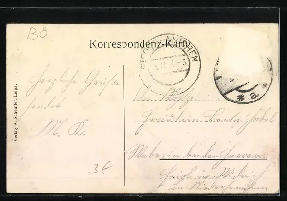 alte Ansichtskarte, gelaufen, Briefmarke entfernt, rückseitig Oberflächenschaden, guter Zustand