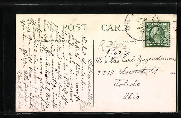 Personenbezogene Daten auf der Rückseite der Karte wurden durch blauen Textmarker unkenntlich gemacht. Die blauen Stellen sind auf die Vorderseite durchgeweicht und wirken sich negativ auf das Postkartenfoto aus