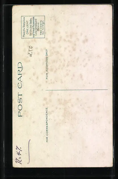Personenbezogene Daten auf der Rückseite der Karte wurden durch blauen Textmarker unkenntlich gemacht. Die blauen Stellen sind auf die Vorderseite durchgeweicht und wirken sich negativ auf das Postkartenfoto aus