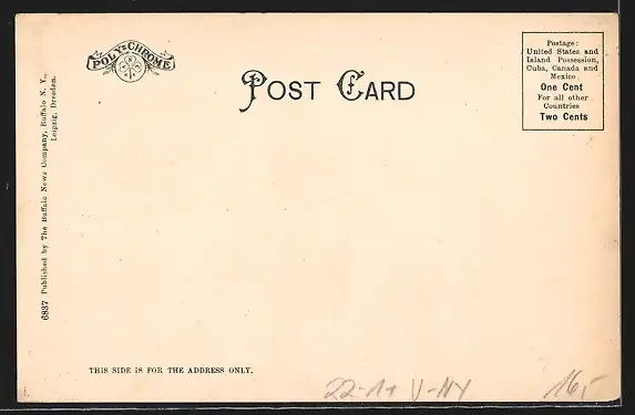 Personenbezogene Daten auf der Rückseite der Karte wurden durch blauen Textmarker unkenntlich gemacht. Die blauen Stellen sind auf die Vorderseite durchgeweicht und wirken sich negativ auf das Postkartenfoto aus