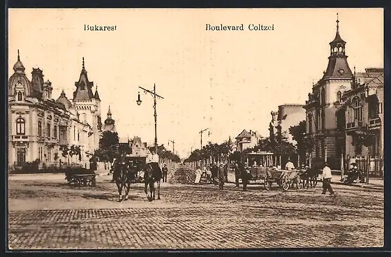 AK Bukarest, Boulevard Coltzei, Platzansicht mit Strassenbahn, Leute