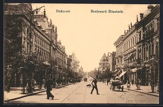 AK Bukarest, Boulevard Elisabeth mit Strassenbahn
