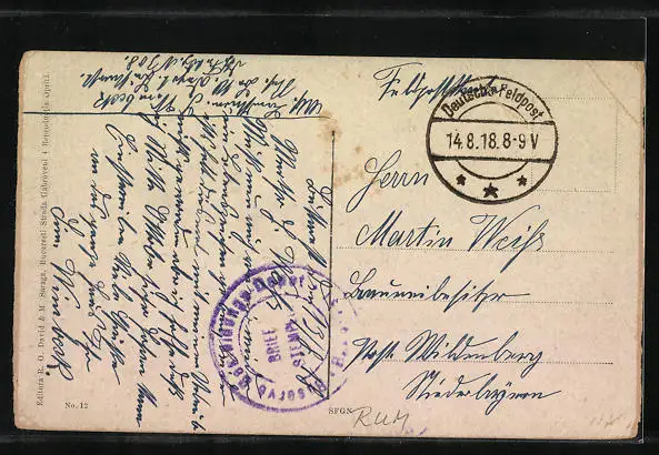 gelaufen 1918 als Feldpost, Eckknick li. oben, Bugspur oben li., guter Zustand