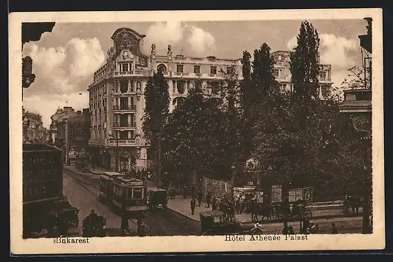 AK Bukarest, Hotel Athenée Palast mit Strassenbahn