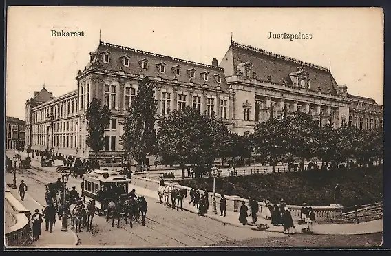 AK Bukarest, Justizpalast, Strassenbahn, Pferdebahn
