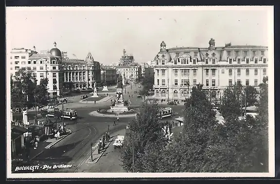 AK Bukarest, Strassenbahnen am Denkaml auf dem Boulevard Bratianu