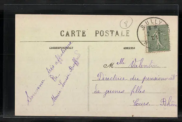 Personenbezogene Daten auf der Rückseite der Karte wurden durch blauen Textmarker unkenntlich gemacht. Die blauen Stellen sind auf die Vorderseite durchgeweicht und wirken sich negativ auf das Postkartenfoto aus