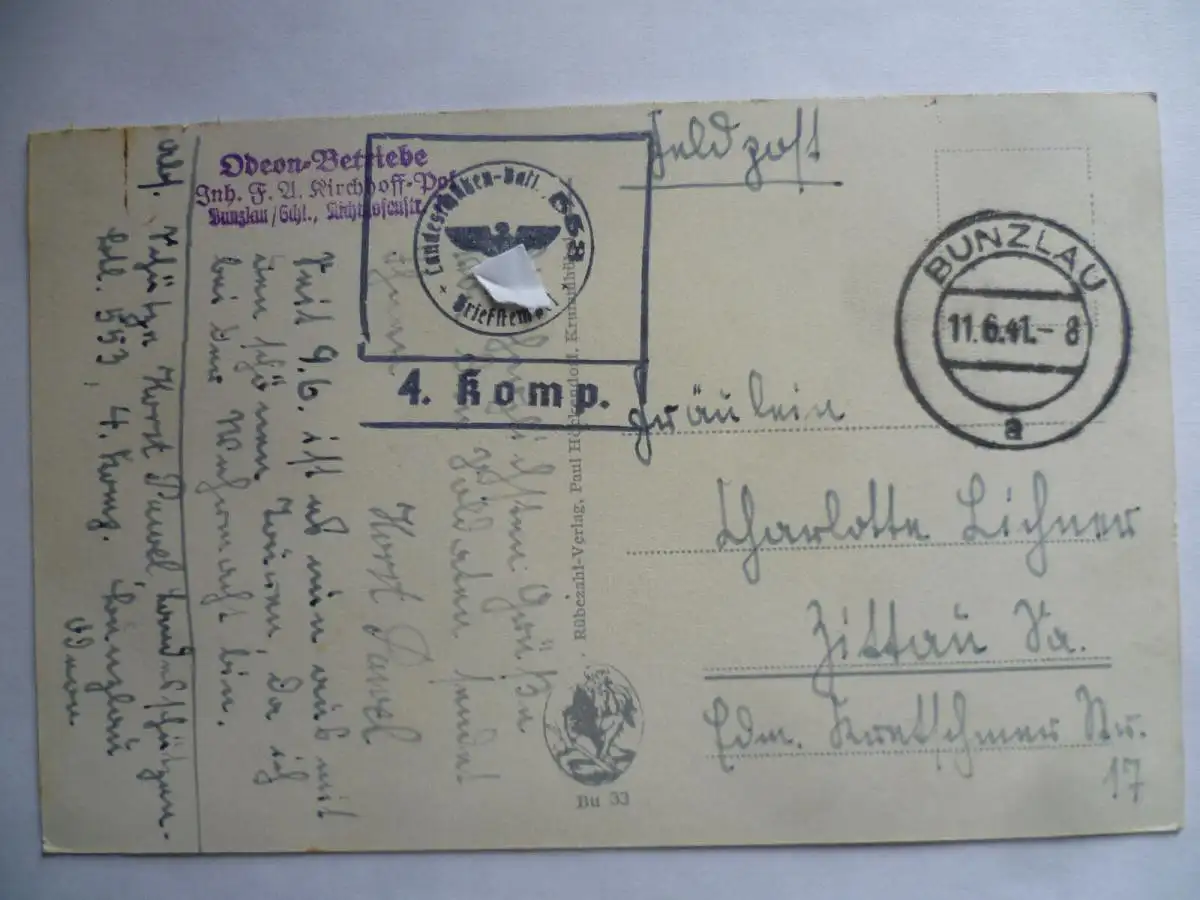 Odeon, Markt, Rathaus, Am Stadttheater. Rübezahl-Verlag Paul Höckendorf, Krummhübel. Rückseitig Stempel Odeon-Betriebe Inh. F. A. Kirchhoff-Pol, Bunzlau i. Schlesien. Gelaufen 1941 als Feldpost. Gut erhalten.