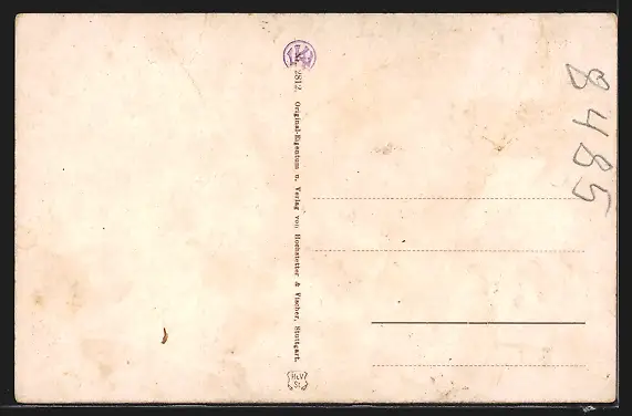 Personenbezogene Daten auf der Rückseite der Karte wurden durch blauen Textmarker unkenntlich gemacht. Die blauen Stellen sind auf die Vorderseite durchgeweicht und wirken sich negativ auf das Postkartenfoto aus