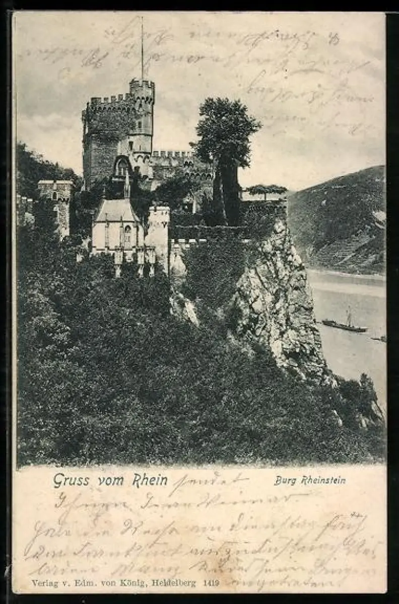 AK Burg Rheinstein, Gesamtansicht mit Rheinblick