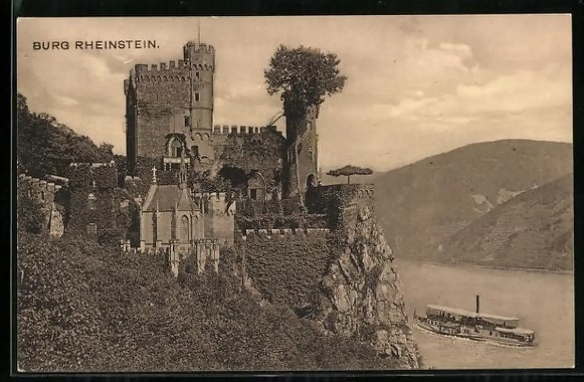 AK Burg Rheinstein, Gesamtansicht mit Rheindampfer