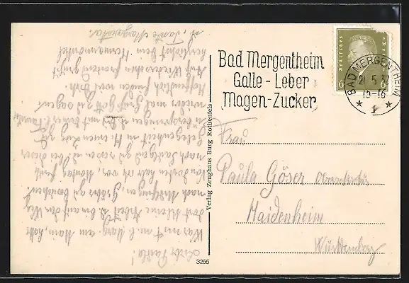 Personenbezogene Daten auf der Rückseite der Karte wurden durch blauen Textmarker unkenntlich gemacht. Die blauen Stellen sind auf die Vorderseite durchgeweicht und wirken sich negativ auf das Postkartenfoto aus