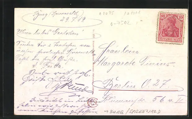 Personenbezogene Daten auf der Rückseite der Karte wurden durch blauen Textmarker unkenntlich gemacht. Die blauen Stellen sind auf die Vorderseite durchgeweicht und wirken sich negativ auf das Postkartenfoto aus