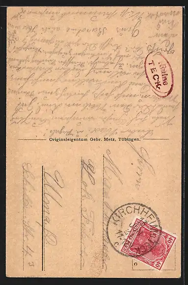 Personenbezogene Daten auf der Rückseite der Karte wurden durch blauen Textmarker unkenntlich gemacht. Die blauen Stellen sind auf die Vorderseite durchgeweicht und wirken sich negativ auf das Postkartenfoto aus