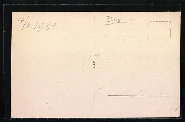 Personenbezogene Daten auf der Rückseite der Karte wurden durch blauen Textmarker unkenntlich gemacht. Die blauen Stellen sind auf die Vorderseite durchgeweicht und wirken sich negativ auf das Postkartenfoto aus