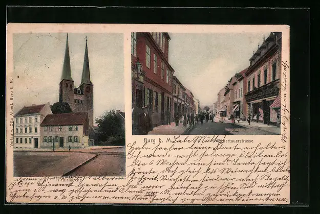 AK Burg b. M., Schartauerstrasse mit Geschäft, Nicolaikirche