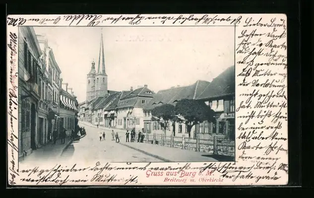 AK Burg b. M., Strasse Breiteweg mit Geschäften und Oberkirche