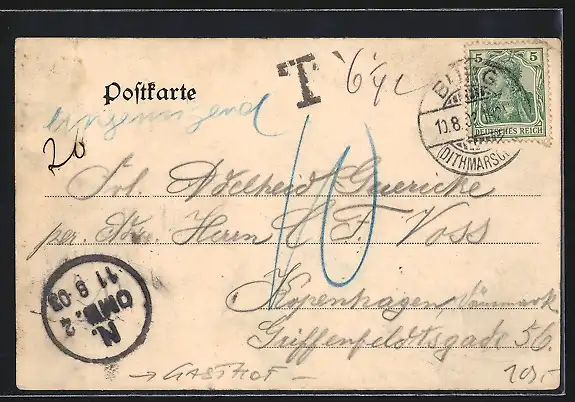 Personenbezogene Daten auf der Rückseite der Karte wurden durch blauen Textmarker unkenntlich gemacht. Die blauen Stellen sind auf die Vorderseite durchgeweicht und wirken sich negativ auf das Postkartenfoto aus