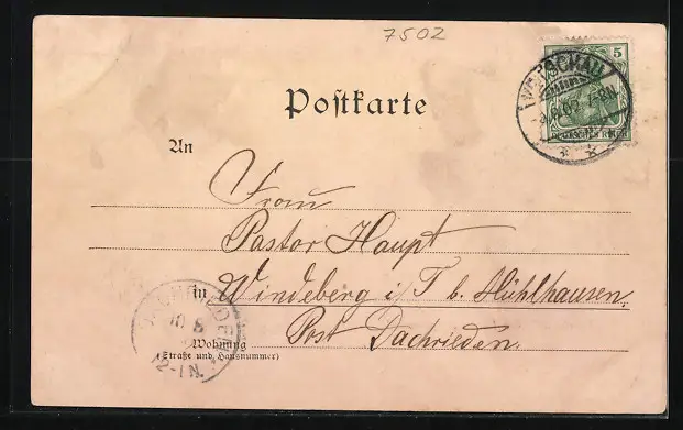 Personenbezogene Daten auf der Rückseite der Karte wurden durch blauen Textmarker unkenntlich gemacht. Die blauen Stellen sind auf die Vorderseite durchgeweicht und wirken sich negativ auf das Postkartenfoto aus