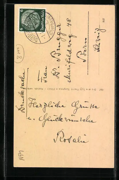 Personenbezogene Daten auf der Rückseite der Karte wurden durch blauen Textmarker unkenntlich gemacht. Die blauen Stellen sind auf die Vorderseite durchgeweicht und wirken sich negativ auf das Postkartenfoto aus
